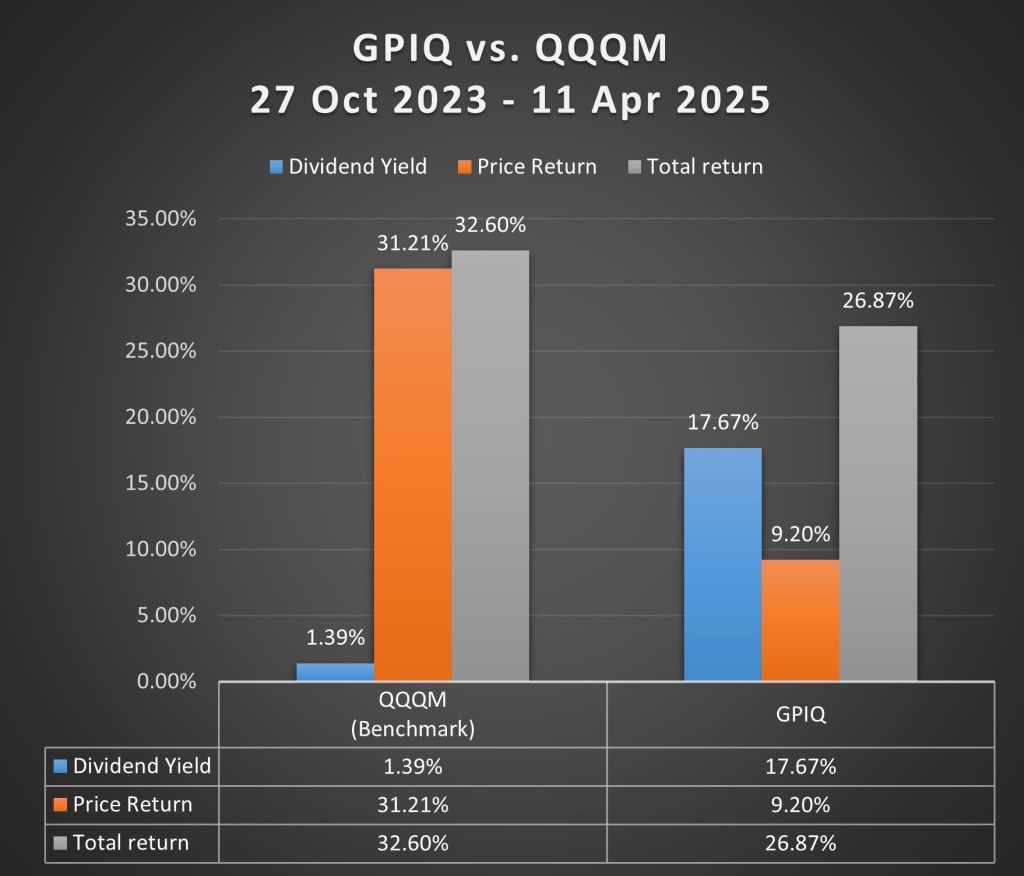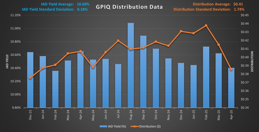 GPIQ is my favorite of the three. It has the lowest expense ratio of all covered call ETFs that I’ve seen: 0.29%. It buys a portfolio of stocks that replicates the Nasdaq-100 index, then sells at-the-money calls against Nasdaq-100 underliers, such as ETFs like QQQM. The call coverage (meaning how much of the portfolio it writes calls against) is between 25-75%. The lower coverage allows GPIQ to have more capital growth potential. The stated goals of the fund are to provide a stable rate of income while capturing the majority of the return and risk of the Nasdaq-100.