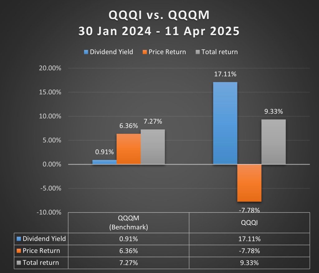 QQQI is the newest of the three funds. The chart below shows the three funds’ performance since QQQI’s inception, the earliest date all three ETFs existed simultaneously.