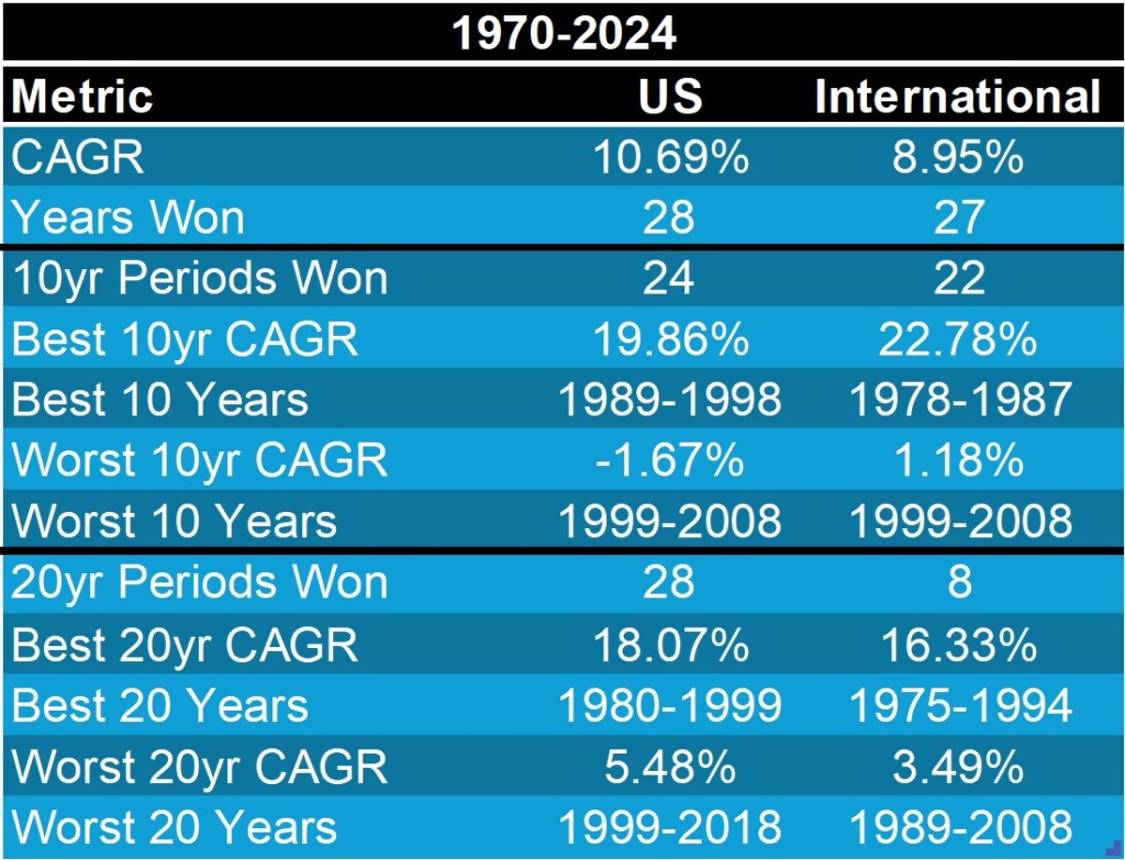 This is a high-level look at 55 years of US and international stock return data, measured by the S&P 500 and MSCI EAFE, respectively.